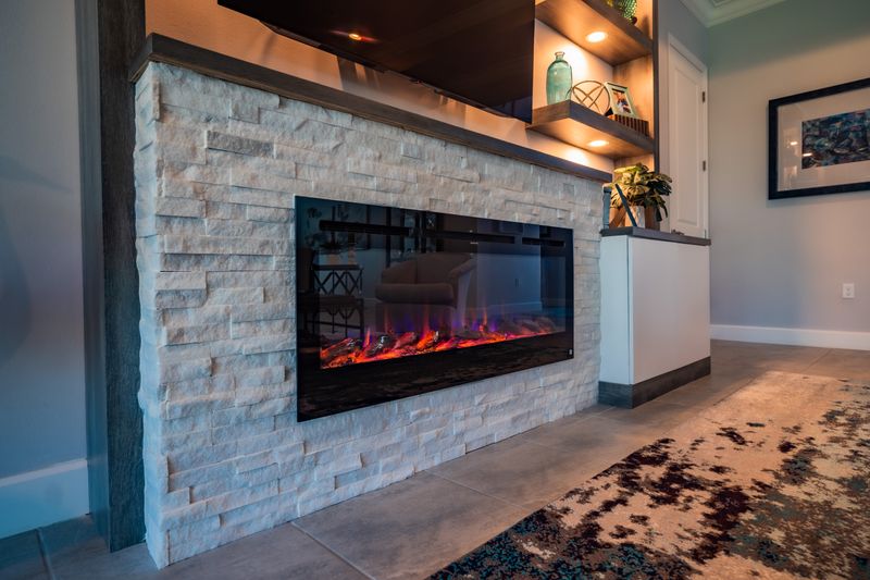 Custom wall unit with shelving, storage, LED Lighting, and an electric fireplace. Dan & Wendy wanted to add some personality to his living room and decided to go with a custom wall unit with lots of storage. When designing their project, they chose wood shelves, ledgestone, and the electric fireplace to bring some texture and warmth into the space.