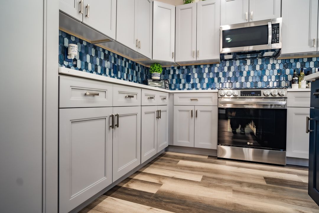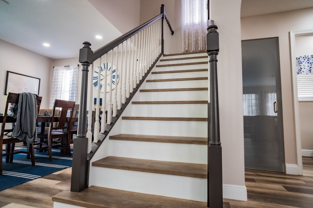 Main living area flooring, stairs, second story, and complete interior painting. The Kiersts went for a bold choice and chose to bring in the blues into their home. The tone-on-tone shaker cabinets paired perfectly with the Statuario Silver Quartz countertop and left enough room for the backsplash to make a statement. The best way to add some diversity in style into their home was to go with different color cabinets for the bathrooms.
